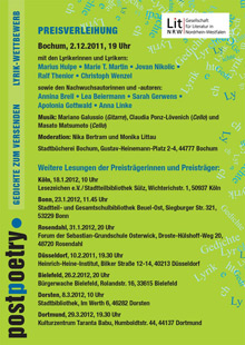 Zum dritten Mal findet 2012 das Projekt postpoetry statt. Dank der Unterstützung durch das Land Nordrhein-Westfalen und der Kunststiftung NRW konnten die Preise in diesem Jahr deutlich aufgewertet werden.
